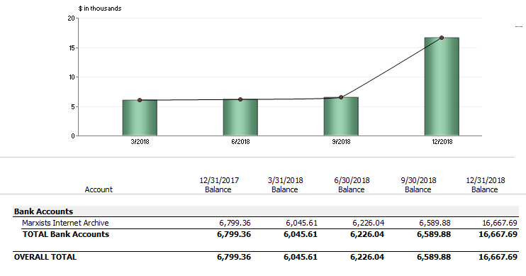 We started 2018 with US$6,799.36 in our bank acount, and ended the year with US$16,667.69. For the first three quarters of the year, our average quartely balance was US$6,287.18. We received a US$9,990.00 cash infusion in December 2018 from the sale of our marx.org domain name.