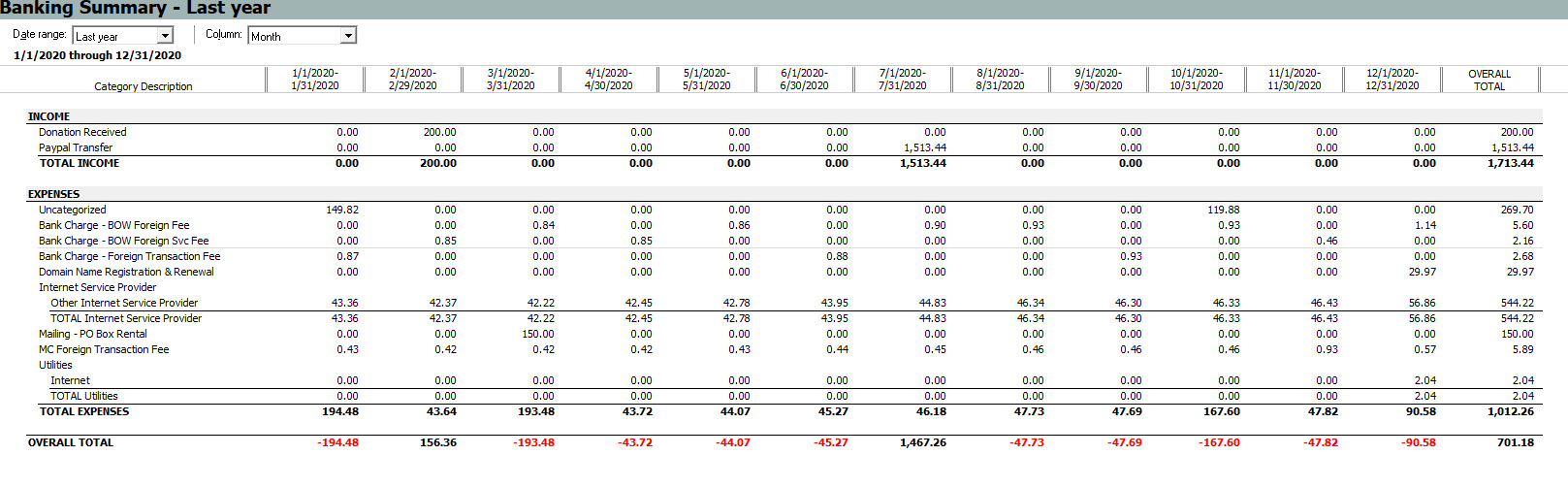 Our gross expenses in 2020 amounted to US$1,012.26. Internet hosting continued to be our greatest expense, directly accounting for US$544.22, or 53.76% of expeditures, for the year. Indirect cost of our hosting arrangement were another US$16.33 incurred in bank and credit card foreign transaction fees. Thus, webhosting accounted for US$560.55 in expenditures. A related expense was the renewal of our domain names, accounting for US$29.97