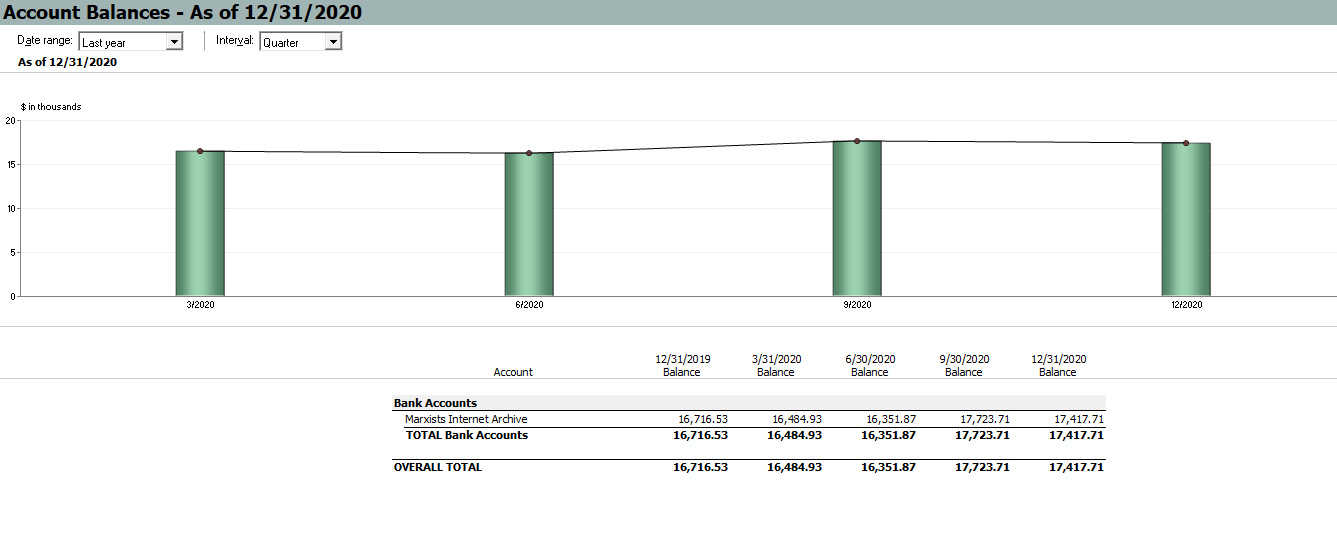 We started 2020 with US$16,716.53 in the bank. Our year-end bank balance was US$17,417.71