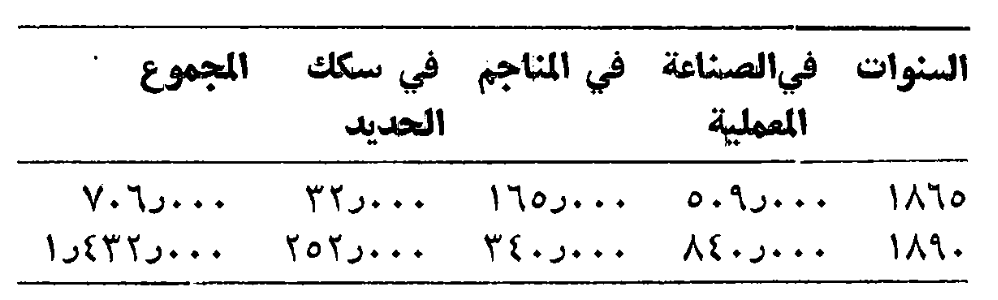 يتبين من الجدول انه في العام 1879 كان يوجد 356000 عامل (من مجموع يبلغ 752000) يتمركزون في 103 مراكز، في حين يرتفع الرقم إلى 451000 (من أصل 876000) للعام 1890. وبذلك يكون عدد العمال قد تزايد بنسبة 26.8 بالمئة، في حين أن الزيادة بالنسبة لعمال المصانع الكبيرة بشكل عام (100 عامل وما فوق) فإنها لم تتجاوز 22.2 بالمئة، وفي حين تزايد مجموع عدد العمال خلال الفترة بنسبة 16.5 بالمئة.