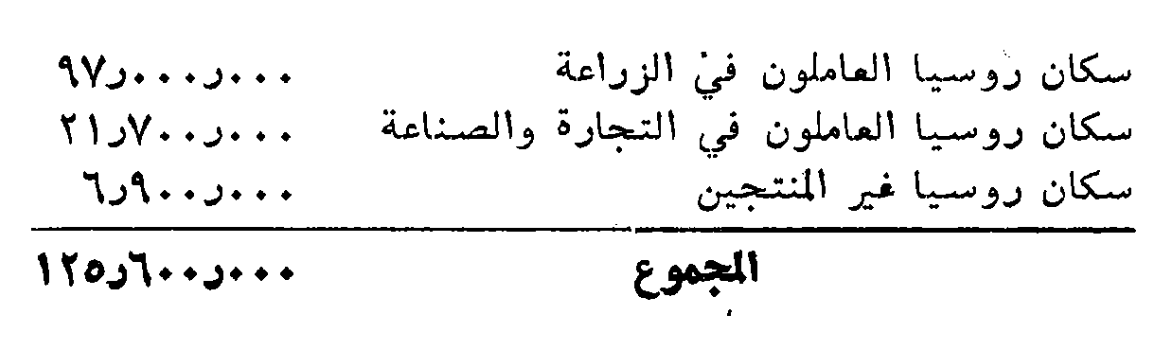 وانه لمن المثير، بادئ بدء، ان نجمع المعطيات عن التوزيع المهني لإجمالي سكان روسيا، بحيث ترسم لنا لوحة عن قسمة العمل الاجتماعية بصفتها قاعدة مجمل عملية الانتاج البضاعي والرأسمالية في روسيا. ولتحقيق ذلك، يجب توزيع اجمالي السكان إلى ثلاثة اقسام فرعية: 1-السكان العاملون في الزراعة، 2-السكان العاملون في التجارة والصناعة، 3-السكان غير المنتجين (وبتحديد أدق، السكان غير المساهمين في النشاط الاقتصادي). ومن بين الفئات التسع الآنفة لذكر (أ إلى ط) توجد فئة واحدة يتعذر تصنيفها مباشرة وكليا ضمن قسم فرعي الأقسام الثلاثة. انها الفئة ز:خدمات خاصة، خدم منزليون وعمال مياومون. يجب توزيع هذه الفئة توزيعا تقريبيا بين السكان العاملين في التجارة والصناعة وبين السكان العاملين في الزراعة. وقد اضفنا إلى هؤلاء الشريحة التي تسكن المدن (2.5 مليون)، في حين اضفنا إلى اولئك الشريحة التي تسكن الأرياف (3.3 مليون). وهكذا حصلنا على اللوحة التالية حول توزيع إجمالي سكان روسيا: