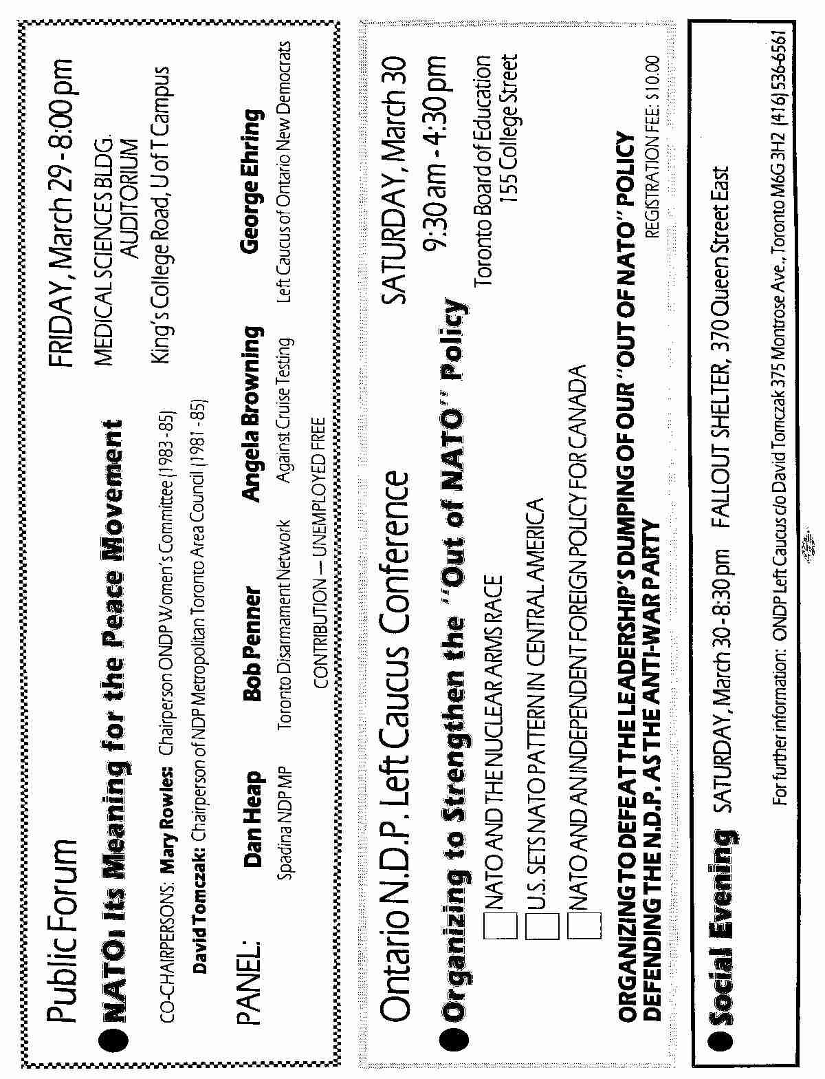 1985Aug-2 | (Notice attachment) ONDP Left Caucus Conference; Public forum: NATO, its meaning for the peace movement |