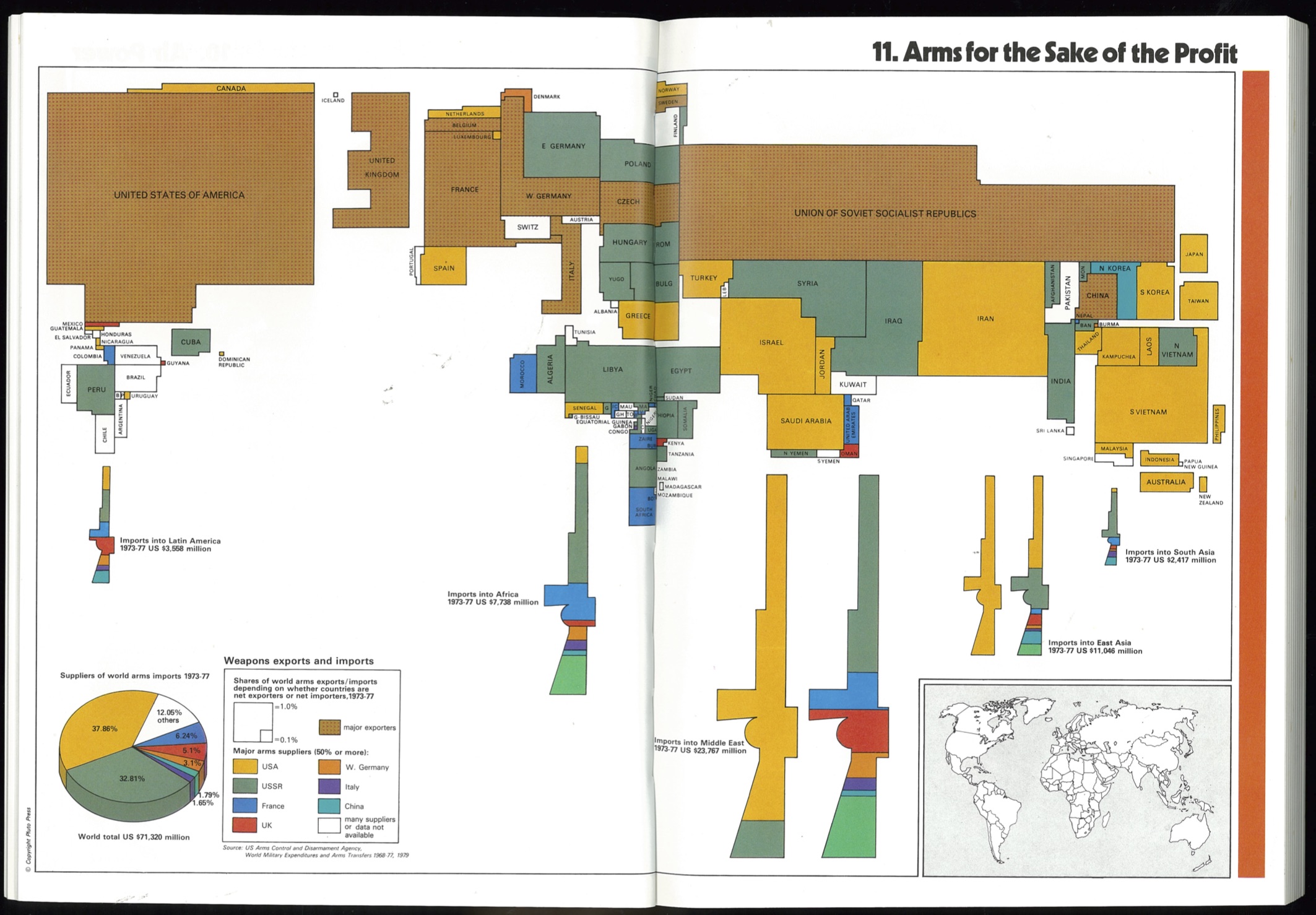 This graphically distorted map shows the relative amounts spent by states on the purchase of foreign arms. Major arms exporters are distinguished from major external arms importers and, in the case of the latter, the major source or arms is shown in colour. The colour breakdown in the figures at the bottom of the map provides a regional summary of the size and source of arms imports.