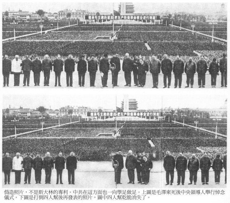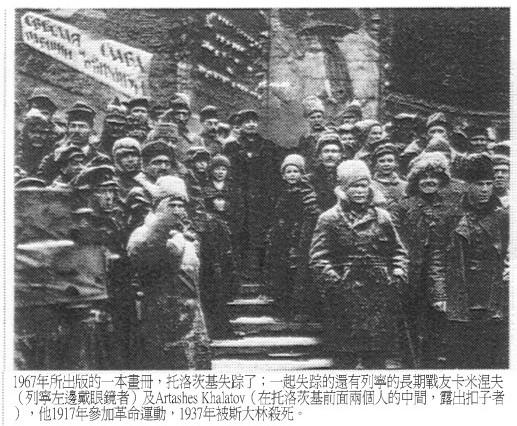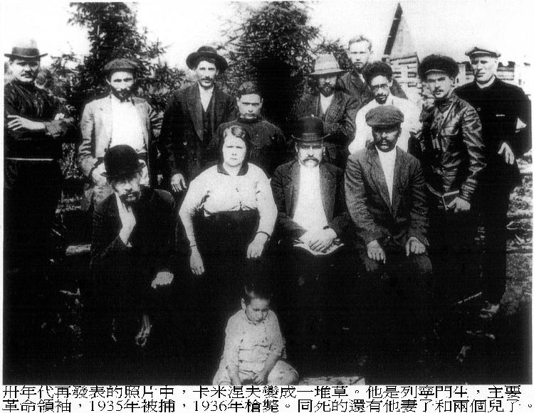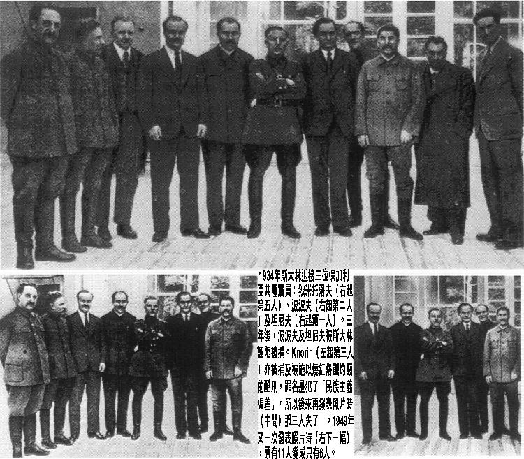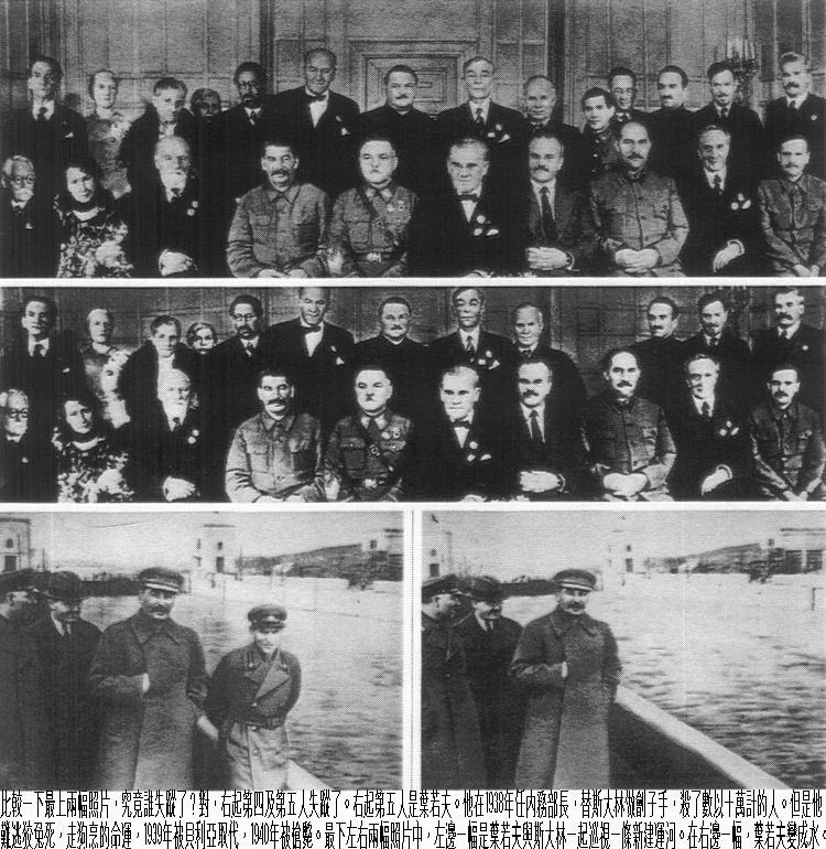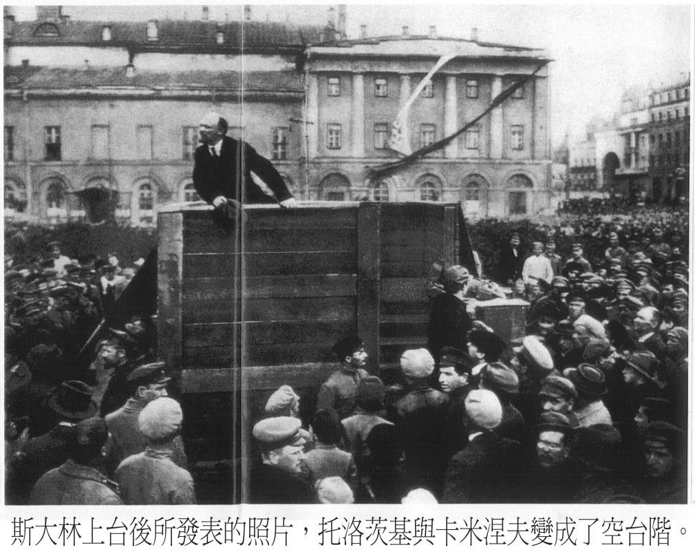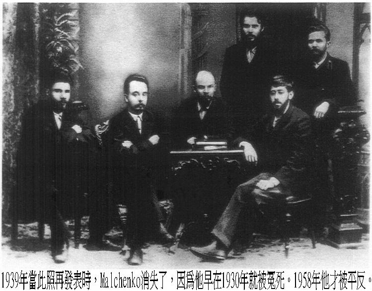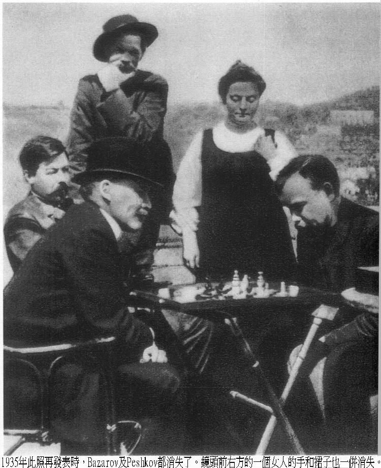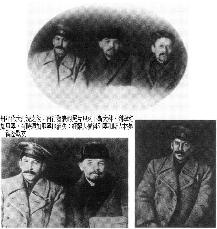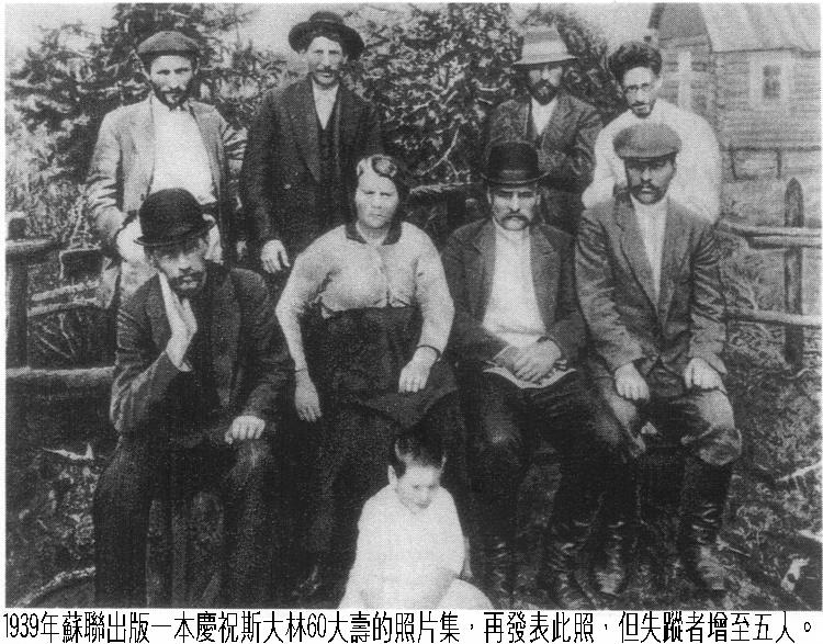 中文马克思主义文库 -> 图片馆 -> 【图库】斯大林伪造照相馆 斯大林伪造照相馆 历代的当权者为了巩固其政权,常常会用各种手段捏造及歪曲真实的历史,以达到愚民的效果,方便其统治。这种捏造历史的情况似乎在那些完全不受人民监督,拒绝任何方式的民主政治,却整天自称是代表人民的伪社会主义政权尤其严重。这里要介绍给读者的是一部难得的有关伪造前苏联历史的照片集,整个伪造过程的幕后黑手不是别人,正是在俄国1917年革命退潮中用尽一切阴谋手段去夺得统治权的独裁者史太林。在他掌权期间,不但进行大规模的清洗计划,把知情者及政治上的异己甚至自己的支持者一一从肉体上消灭,同时任意修改保存历史真相的珍贵图片及艺术品,为的是要消灭俄国十月革命的主要领袖(例如托洛茨基)的历史痕迹,同时伪造自己才是主要领袖的记录,为的是创造全国上下对他的个人崇拜。 幸好,历史最终不是按个人的意志行事的,更不容永远被歪曲。经过有心人的搜寻及研究,被埋没几十年的真相终于又再呈现在公众眼前。这本书叫《人民委员突然消失了》(The Commissar Vanishes),副题是史太林时代对照片及艺术的伪造,作者是英国图像历史学者David King。1997年版。 根据作者的介绍,资料的收集工作始于1970他的一次苏联之旅,当时他发现成千上万在史太林政权治下的受害者影像消失了,于是决定找出真相。之后他花了约三十年时间从各种各样的照片、书籍、海报以及印刷品中收集到廿五万份图像,并选出最精彩的部份收录在这图片集里。 读者会从这部精彩的著作中看到,史太林如何利用图片科学的技术来达到他个人的政治目的,把所有不利于巩固他个人权力的历史人物从照片中剔除。他命令官僚用无所不用其极的手段去窜改历史图像。其中包括把照片中的人物用喷漆涂污,删除图片中原有的人物,窜改群众场景等等。本书采用的封面就是其中一幅著名的照片:三名苏共高层干部在不同时期刊登的官方照片中陆续消失,最后只剩下史太林一人!类似的手法在其它地方出现过无数次。他尤其用心去捏造他在革命伊始已是列宁的亲密战友,以及消灭人们对革命第二号领袖人物托洛茨基 (史太林的宿敌,后被史派遣的格别乌杀害) 的记忆,照片中许多领袖人物在史太林手上最后只变成一堆干草,沼泽,耕地,梯级或干脆黑漆一片... 书中所用的部份图片是来自一位出色的前苏联艺术家的个人珍藏,其中有些人物──许多是被史太林认为是异己而遭清洗掉的──的面容都遭深色墨水涂污至难以辨认。