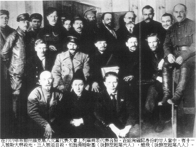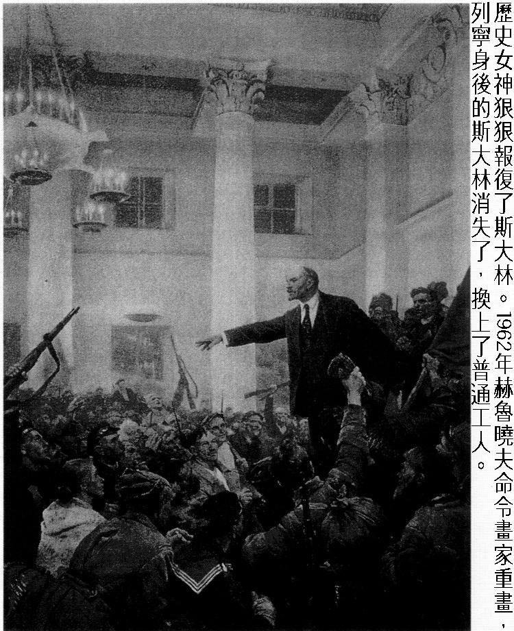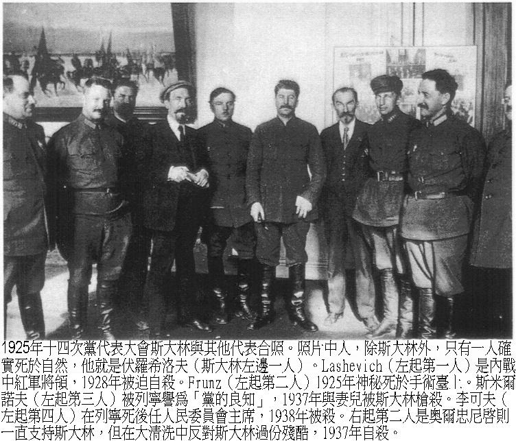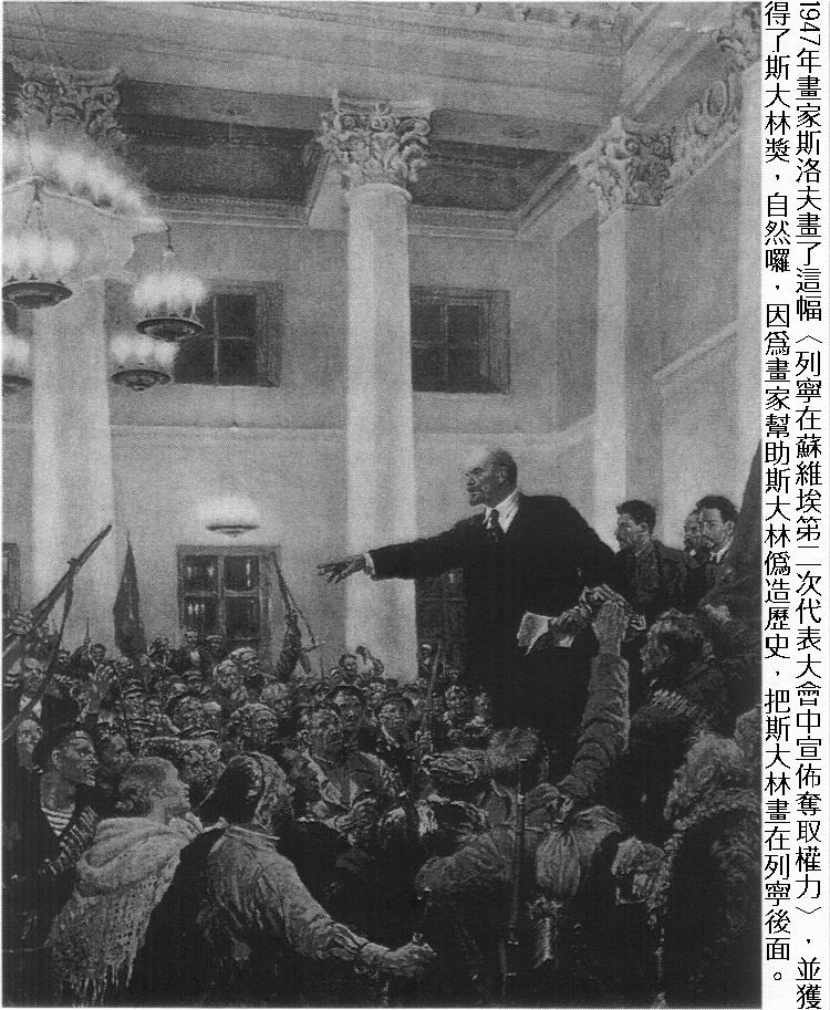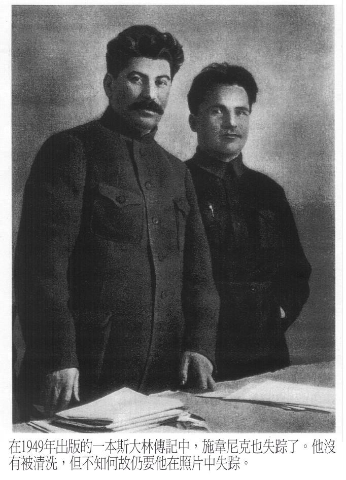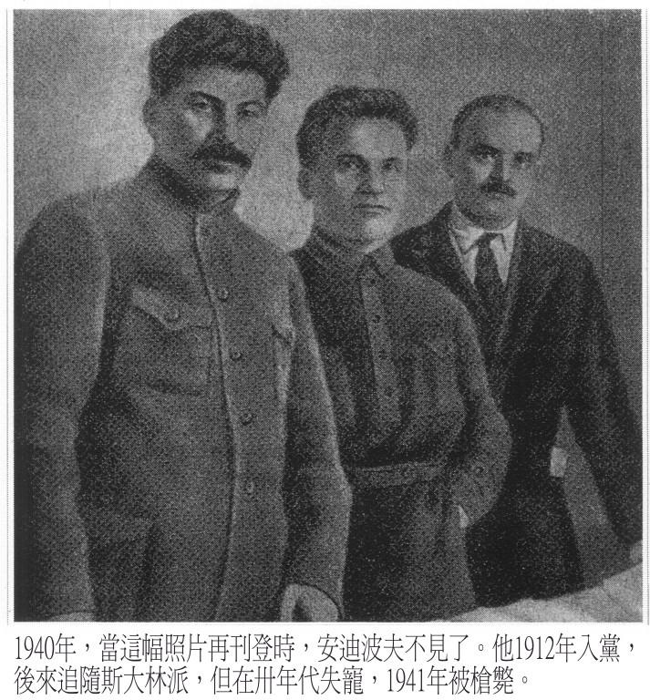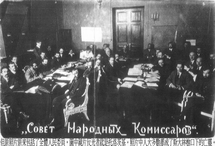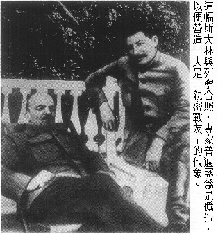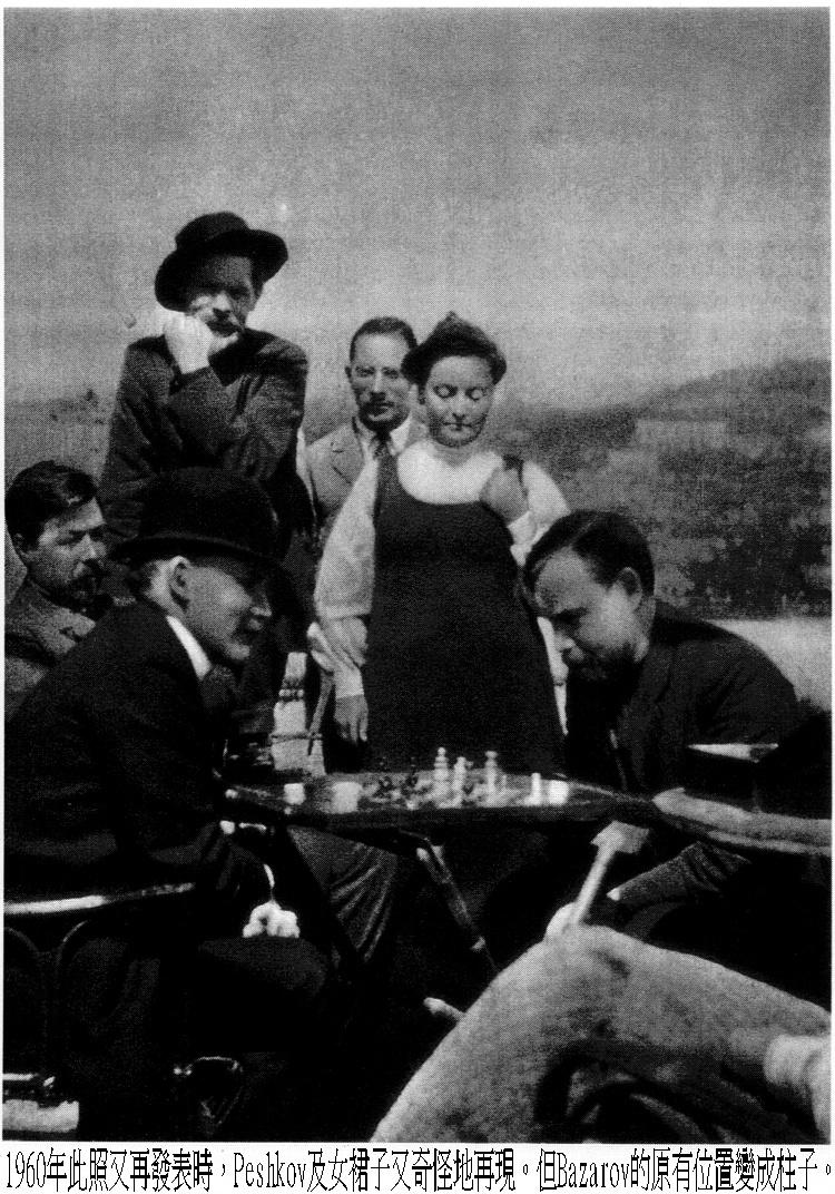 中文马克思主义文库 -> 图片馆 -> 【图库】斯大林伪造照相馆 斯大林伪造照相馆 历代的当权者为了巩固其政权,常常会用各种手段捏造及歪曲真实的历史,以达到愚民的效果,方便其统治。这种捏造历史的情况似乎在那些完全不受人民监督,拒绝任何方式的民主政治,却整天自称是代表人民的伪社会主义政权尤其严重。这里要介绍给读者的是一部难得的有关伪造前苏联历史的照片集,整个伪造过程的幕后黑手不是别人,正是在俄国1917年革命退潮中用尽一切阴谋手段去夺得统治权的独裁者史太林。在他掌权期间,不但进行大规模的清洗计划,把知情者及政治上的异己甚至自己的支持者一一从肉体上消灭,同时任意修改保存历史真相的珍贵图片及艺术品,为的是要消灭俄国十月革命的主要领袖(例如托洛茨基)的历史痕迹,同时伪造自己才是主要领袖的记录,为的是创造全国上下对他的个人崇拜。 幸好,历史最终不是按个人的意志行事的,更不容永远被歪曲。经过有心人的搜寻及研究,被埋没几十年的真相终于又再呈现在公众眼前。这本书叫《人民委员突然消失了》(The Commissar Vanishes),副题是史太林时代对照片及艺术的伪造,作者是英国图像历史学者David King。1997年版。 根据作者的介绍,资料的收集工作始于1970他的一次苏联之旅,当时他发现成千上万在史太林政权治下的受害者影像消失了,于是决定找出真相。之后他花了约三十年时间从各种各样的照片、书籍、海报以及印刷品中收集到廿五万份图像,并选出最精彩的部份收录在这图片集里。 读者会从这部精彩的著作中看到,史太林如何利用图片科学的技术来达到他个人的政治目的,把所有不利于巩固他个人权力的历史人物从照片中剔除。他命令官僚用无所不用其极的手段去窜改历史图像。其中包括把照片中的人物用喷漆涂污,删除图片中原有的人物,窜改群众场景等等。本书采用的封面就是其中一幅著名的照片:三名苏共高层干部在不同时期刊登的官方照片中陆续消失,最后只剩下史太林一人!类似的手法在其它地方出现过无数次。他尤其用心去捏造他在革命伊始已是列宁的亲密战友,以及消灭人们对革命第二号领袖人物托洛茨基 (史太林的宿敌,后被史派遣的格别乌杀害) 的记忆,照片中许多领袖人物在史太林手上最后只变成一堆干草,沼泽,耕地,梯级或干脆黑漆一片... 书中所用的部份图片是来自一位出色的前苏联艺术家的个人珍藏,其中有些人物──许多是被史太林认为是异己而遭清洗掉的──的面容都遭深色墨水涂污至难以辨认。