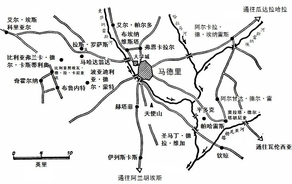 叛军将领原先预计他们将在十月十二日,也就是奔牛节那一天开进马德里[1]。巴莱拉将军负责指挥进攻部队:他手下有两万名正规军士兵、摩尔兵和外籍军团雇佣军,他们嗜血好战、纪律严明而又充满自信,深信自己不会遭遇任何抵抗。起初一切进展顺利:进攻部队沿着塔霍河谷行进,在十月十日与从瓜达拉马山脉出发的达维拉[2]军会合。途中他们只遭到了由乌里瓦里和巴约率领的列万特民兵的一些骚扰,而这种游击行动是无法阻止现代化军队的前进的,要想阻止它前进,除了正面进攻别无他法。叛军在三天内推进了二十七千米;在十五日占领了查皮内里亚(Chapinería),在十八日占领了纳瓦尔卡尔内洛(Navalcarnero),又在二十一日攻占了伊列斯卡斯(Illescas);叛军就像一把钳子一样,牢牢地钳住了马德里。