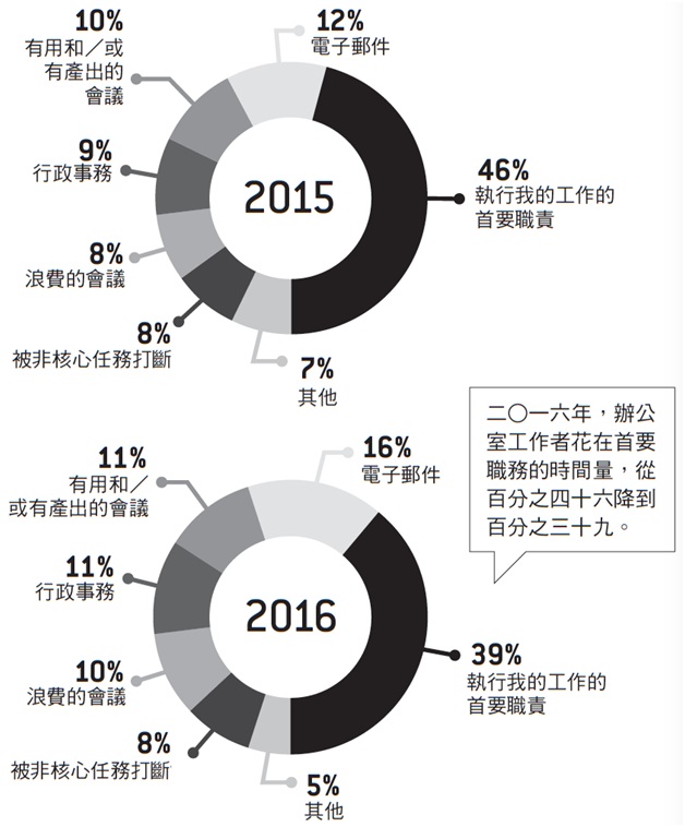 根据这份调查,美国坐办公室的工作者自陈投注于实际业务的时间量,从二○一五年的百分之四十六降至二○一六年的百分之三十九,减少的比例可归咎于处理电子邮件的时间(从百分之十二升高到百分之十六)、「浪费的」会议(百分之八升高到百分之十)和行政事务(百分之九升高到百分之十一)。照这种趋势下去,不出十年,美国的办公室工作者就没有一个真的在做事的了,所以骤升的数字必然有一部分来自随机的统计噪声。但除此不论,这份调查清清楚楚显示:(一)美国办公室里,超过一半的工时都花在废冗的事情上,而且(二)这个问题每况愈下。
