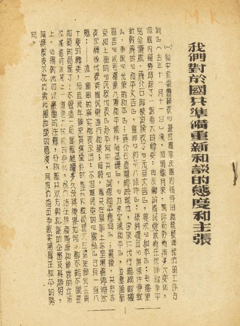 (四)从现时国共两党准备和谈的种种事实和企图分析起来,它们的和平妥协是绝少任何客观条件的。即使双方将来互派代表进行和平谈判,甚至根据谈判成立某种形式的联合政府,但国共间的基本矛盾还是继续存在的,往后的破裂和重起战争仍然是不可避免的。最后,中国将被迫拖进美苏第三次大战的浩劫中。