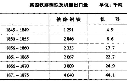 但是为什么英国的对手们(除美国)会接受这么明显的不利做法呢?(对于低开发国家来说,由于他们不具工业竞争能力,国际自由贸易当然是有吸引力的。例如,美国南部各州相当乐意保持英国这个可以无限制销售其棉花的市场,所以强烈坚持自由贸易,直到被北方征服为止。)较过分的说法是:国际自由贸易之所以获得进展,是因为在这一短暂时刻,自由化的乌托邦令人衷心诚服,即使政府亦然,而且他们深信这是历史发展的必然趋势。毋庸置疑,国际自由贸易的形成也深受经济要求的影响,而且经济要求似乎具有自然法则般的力量。然而,理智信念很少能比得上切身利益。事实是,大多数工业经济在这段时期都从自由贸易中发现两个有利之处:第一,经济在这段期间的普遍增长,与19世纪40年代相比确实非常壮观,所有国家皆从中受惠,英国受惠尤甚。无论是大量不受限制的出口贸易,还是大批毫无阻碍的食品原料供应,包括必要的进口供应,都是令人愉快的。即使某些特殊的利益会因此受损,但自由化还是会带来其他利益。第二,不管资本主义各国将来的经济对立情况如何,在工业化的这个阶段,能够取得英国的设备、资源和技术,显然是对自己有帮助的。例如,英国铁路钢铁机器的大量出口,不但不会抑制其他国家的工业化,反而有所助益(见下表)。