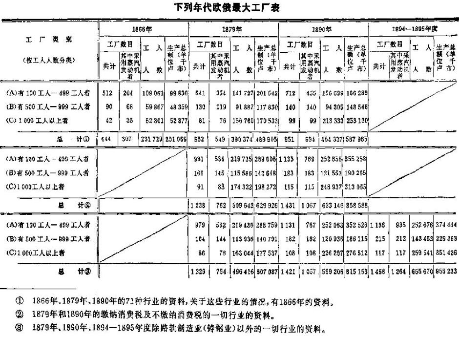 在16年中间,蒸汽发动机马力的数量在俄国增加了两倍,而在欧俄则增加了一倍半。蒸汽机数目增加得较少,因为每一蒸汽机的平均马力大大增加了,在欧俄从18马力增加到24马力,而在波兰王国则从18马力增加到41马力。因此,大机器工业在这一时期发展得很快。就蒸汽机马力数量来看,在1875—1878年站在其他省份前面的是下列各省:圣彼得堡省(17808马力)、莫斯科省(13668马力)、基辅省(8363马力)、彼尔姆省(7348马力)、弗拉基米尔省(5684马力),这5省共有52871马力,约占欧俄总数3/5;其次是波多利斯克省(5480马力)、彼得库夫省(5071马力)、华沙省(4760马力)。在1892年,这个次序改变了:彼得库夫省(59063马力)、圣彼得堡省(43961马力)、叶卡捷琳诺斯拉夫省(27839马力)、莫斯科省(24704马力)、弗拉基米尔省(15857马力)、基辅省(14211马力)——后面5省共有126572马力,即约为欧俄总数1/2;其次是华沙省(11310马力)与彼尔姆省(11245马力)。这些数字清楚地表明波兰和南俄这两个新的工业中心形成了。在彼得库夫省,蒸汽机马力数量增加了10.6倍,在叶卡捷琳诺斯拉夫和顿河两省[注:由于这两省的省界在1878年以后有了变动,我们把它们合在一起。],从2834马力增加到30932马力,即增加了9.9倍。这些如此迅速发展起来的工业中心,由后列移到了前列,把旧的工业中心挤到后面去了。应该指出:在这些资料中,也显示出制造生产消费品的工业即采矿工业与冶金工业有特别迅速的增长。在1875—1878年,这种工业中使用蒸汽机1040台,22966马力(在欧俄),而在1890年则使用蒸汽机1960台,74204马力。这就是说,14年间的增长比起全部工业中的蒸汽发动机总数在16年间的增长还要大。制造生产资料的工业在全部工业中所占的比重愈来愈大。[注:1892年以后,蒸汽发动机在俄国的应用有多么巨大的发展,这可以从下列事实看出来:根据工厂视察员的报告,在1904年,64省有工厂蒸汽锅炉27579个,除农用者外,全国总计有蒸汽锅炉31887个。(第2版注释)] 七 大工厂的增加上面已经证明我国工厂统计资料不能令人满意,所以我们不得不依靠更复杂的计算来确定改革后俄国大机器工业是如何发展起来的。我们选择了1866年、1879年、1890年以及1894—1895年度关于最大工厂即有厂内工人100以上的工厂的资料[注:资料来源:《财政部年鉴》第1编(只有71种行业的资料);《工厂一览表》,第1版和第3版,有一切行业的资料,正如在《工厂索引》中一样;但是,为了把《工厂索引》的资料与《工厂一览表》的资料作一比较,必须从列入《工厂一览表》清单的行业中除去路轨制造业。那些把家庭工人也列入工厂工人的作坊,已经被减去。这种把家庭工人列入的情形,有时候在上述出版物的注释中直接讲明了;这种情形有时候可以从各年资料的比较中看出来:例如,参看1879年、1890年以及1894—1895年度萨拉托夫省棉织业的资料(参看第6章第2节(1))。辛茨海梅尔(《论德国大工厂生产扩张的限度》1893年斯图加特版)把有50个工人以上的工厂企业归入大工厂企业。我们认为这个标准绝对不低,但是由于计算俄国资料很困难,所以只得限于最大的工厂了。]。厂外工人只是在1894—1895年度《工厂索引》的资料中才严格地区分开来;因此,前面几个年份(特别是1866年和1879年)的资料,虽然有注释中所加的修正,可能仍然有一些夸大。 我们举出这些最大工厂的资料: ![]() 我们从1866年、1879年和1890年的资料开始来分析这个表。大工厂总数在这些年内变动如下:644—852—951,或者按百分比计算,100—132—147。因此,在24年内,大工厂数目差不多增加了半倍。此外,如果拿大工厂各个类别的资料来看,那么我们可以看到:工厂愈大,其数目增加也愈来愈快(A:512—641—712;B:90—130—140;C:42—81—99)。这表明生产日益集中。 使用机器的工厂数目比工厂总数增加得更快;以百分比计算为:100—178—226。愈来愈多的大工厂改用蒸汽发动机。工厂愈大,其中使用蒸汽发动机的工厂就愈多;把这些工厂同该类工厂总数的百分比计算出来,我们就得到如下的数字:(A)39%—53%—63%;(B)75%—91%—100%;(C)83%—94%—100%。蒸汽发动机的应用,是与生产规模的扩大及生产协作的扩大紧密联系着的。 全部大工厂工人人数变动的百分比如下:100—168—200。在24年中,工人人数增加了1倍,即超过了“工厂工人”总数的增加。每一大工厂的平均工人人数按年份为:359—458—488。按类别则为:(A)213—221—220;(B)665—706—673;(C)1495—1935—2154。因此,最大工厂集中的工人比例日益扩大。在1866年,工人在1000以上的工厂,其工人人数占大工厂工人总数的27%;在1879年,占40%;在1890年,占46%。 全部大工厂的生产总额的变动,用百分比表示是:100—243—292。按类别则为:(A)100—201—187;(B)100—245—308;(C)100—323—479。因此,全部大工厂的生产总额差不多增加了两倍,而且工厂愈大,这种增加的速度就愈快。但是,如果我们把各类工厂每年的劳动生产率作一比较,那么我们就会看到稍微不同的情形。全部大工厂中,每个工人的平均生产额为866—1250—1260卢布,而按类别则为:(A)901—1410—1191;(B)800—1282—1574;(C)841—1082—1188。因此,在这里看不出(每一工人)每年生产额由最低的类别到最高的类别的上升。这种情况之所以发生,是由于各种行业的工厂以不同的比例归入各类,而这些行业的原料价格不等,因而每一工人的全年生产额也不同。[注:例如,在1866年,列入A类的有17个精制糖厂,其中