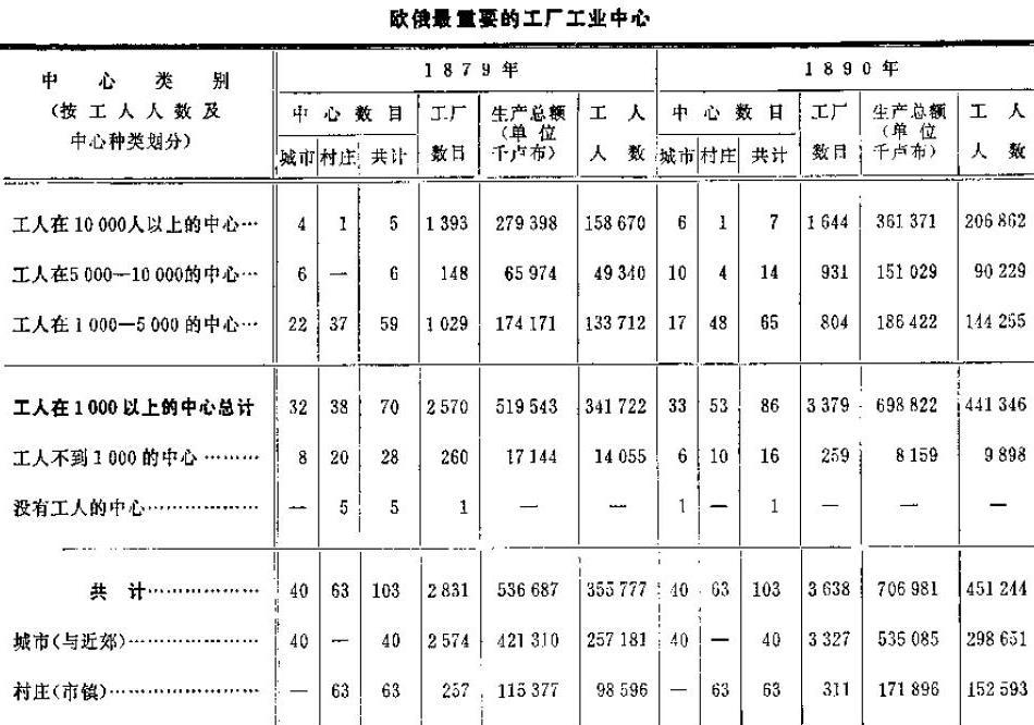 在采矿工业中,大企业工人的集中还更厉害(虽然生产上应用蒸汽发动机的企业的百分比比较低些);在305000名矿业工人中,有258000人,即84.5%的矿业工人集中在有工人100名以上的企业里;差不多一半矿业工人(305000中的145000)在少数有工人1000名以上的最大工厂内做工。在欧俄全部工厂工人与矿业工人(1890年为118000)当中,3/4(74.6%)集中在有工人100名以上的企业里;差不多一半(1180000中的570000)集中在有工人500名以上的企业里。[注:根据1895年的工业调查,在德国的全部工业中(矿山建筑业也包括在内,这一部门在俄国并未登记),有工人1000以上的企业248个;这些企业中的工人为430286名。可见,俄国的最大工厂比德国的还要大。] 尼·—逊先生说,1880—1890年时期同1865—1880年时期比较起来,资本主义的发展和“工厂人口”的增长“都变慢了”;我们认为在这里研究一下尼·—逊先生所提出的这个问题,并不是多余的。[注:1894年《俄国财富》第6期第101页及以下各页。我们所举出的大工厂的资料,也证明1879—1890年增长的百分比比1866—1879年要小些。]尼·—逊先生依靠他那独特的逻辑,居然从这个卓绝的发现中作出结论,仿佛“事实完全确证了”《论文集》中所提出的论断,即“资本主义在达到其发展的一定界限时,就会缩小自己的国内市场”。——第一,从“增长变慢”就推断出国内市场的缩小,是毫无根据的。工厂工人人数既然比人口增长得快(而根据尼·—逊先生自己的资料也正是如此;从1880年到1890年增长了25%),这就意味着人口在脱离农业,甚至个人消费品的国内市场也在增长(更不必说生产资料的市场了)。第二,百分比上所表现的“增长的减少”,是资本主义国家在一定发展阶段上必定发生的现象,因为用百分数表示,小的数量总是比大的数量增长得快。根据资本主义在最初阶段发展得特别迅速的事实,只能作出结论说:年轻国家有赶过年老国家的趋势。把初期增长的百分比当作以后各个时期的标准是错误的。第三,“增长的减少”这一事实本身,绝对不是尼·—逊先生所举出的各个时期的比较所能证明的。资本主义工业的发展只能是周期性的;因此,要比较各个时期,就必须举出很多年的资料[注:例如,象杜冈-巴拉诺夫斯基先生在其《俄国工厂今昔》第307页及图中所做的那样。依据这个图可以清楚地看出,1879年,尤其是1880年和1881年,是特别高涨的年份。],以便把特别繁荣、高涨的年代和衰落的年代划分清楚。尼·—逊先生不这样做,就犯了很大的错误,他没有看出1880年是特别高涨的一年。不仅如此,尼·—逊先生甚至毫不在乎地“捏造出”相反的论断。他议论道:“还须指出,中间的〈1865年和1890年中间的〉1880年是一个歉收的年份,因此在该年内所登记的工人人数,比正常年份要少些”!!(同上,第103—104页)。尼·—逊先生只要看看他从中取得1880年的数字的那本出版物(《工厂一览表》第3版)的正文,他就会在那里看到,1880年的特点是工业,特别是制革业和机器制造业的“飞跃”(第Ⅳ页),这是因为战后对制成品的需求大大增加,政府订货大大增多。只要把1879年的《工厂一览表》翻一翻,就可以清楚地了解这种飞跃的程度。[注:例如,制呢业加紧制造军用呢;制革业欣欣向荣;大工厂“为军事部门”制造250万卢布的革制品。(第288页)伊热夫斯克工厂与谢斯特罗列茨克工厂制造炮兵用品共值750万卢布,而1890年则为125万卢布。铜器业把注意力放在制造军用品及军事器材上(第388—389页);火药厂日夜开工等等。]但是尼·—逊先生为了证明自己的浪漫派理论,竟不惜公然歪曲事实。 八 大工业的分布为了说明大机器工业,除去生产集中在最大工厂的问题之外,生产集中在各个工厂工业中心的问题和工厂中心的各种不同形式的问题也很重要。可惜我国工厂统计不仅供给一些不能令人满意的和不能比较的材料,而且对这些材料的整理也很不够。例如,在现时的出版物中,只以各省为单位来表明工业的分布(而不是象60年代优秀的出版物那样以各个城市和各个县份为单位,这些出版物还用地图来说明工厂工业的分布)。但是为了确切说明大工业的分布,必须采用各个中心,即各个城市、各个工厂村或彼此距离相近的几个工厂村的资料。省或县是太大的地域单位。[注:“……在(莫斯科省)各县的辖区内,工厂的配置很不平衡:在工业十分发达的县份,除了那些由于工厂企业相当密集而可以称为真正工厂中心的地区以外,我们看到许多几乎没有任何工厂工业的乡;相反,在一般缺少工厂的县份,有一些地区,某一行业有了相当程度的发展,除了手工业者的茅舍与小工房以外,还出现了具有工厂生产的一切特征的较大的企业。”(《莫斯科省统计资料汇编》,卫生统计部分,1890年莫斯科版第4卷第1册第141页)这一出版物在现今的工厂统计书刊中是较好的一种,它以详细编制的地图说明了大工业的分布。要得到工厂工业分布的全貌,只缺少各个中心按工厂数、工人数和生产总额的分类。]因此,我们认为必须根据1879年和1890年的《工厂一览表》算出关于我国工厂工业集中在最重要中心的资料。附录(附录三)中所刊载的表,包括了欧俄103个工厂中心的资料,这些工厂中心大约集中了工厂工人总数的一半。[注:只有生产额在2000卢布以上的工厂才列入本表,而磨坊则只有使用蒸汽发动机的才列入。凡是指明厂外工人算作工厂工人的地方,都
