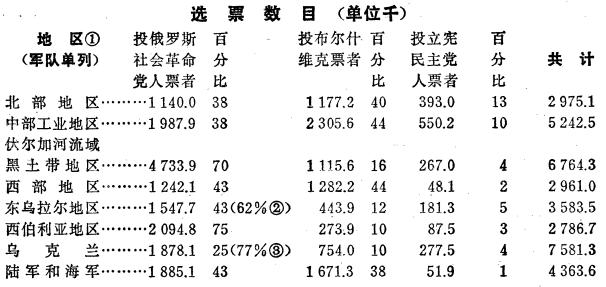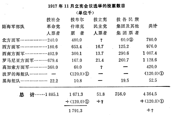 中文马克思主义文库 -> 列宁 -> 《列宁全集》 -> 第38卷 立宪会议选举和无产阶级专政 (1919年12月16日) 社会革命党人[1]出版的文集《俄国革命的一年(1917—1918年)》(1918年莫斯科土地和自由出版社莫斯科版)里,载有尼·瓦·斯维亚季茨基的一篇饶有趣味的文章:《全俄立宪会议选举的结果(序言)》。总共79个选区,作者列举了其中54个选区的数字。 作者考察的范围差不多包括俄国欧洲部分和西伯利亚各省。没有包括的省份有:奥洛涅茨、爱斯兰、卡卢加、比萨拉比亚、波多利斯克、奥伦堡、雅库特和顿河区。 我们先引证尼·瓦·斯维亚季茨基所发表的主要结果,然后再来研究从这些材料中得出的政治结论。 一54个选区在1917年11月份投票的总数是36262560票。作者按7个地区(外加陆军和海军)开列的选票总数是36257960票,但是,他开列的各党派的得票数,加起来就同我所指出的正好一致。 各党派得票情况如下:俄罗斯社会革命党人得1650万票,如果加上其他各民族(乌克兰、穆斯林以及其他民族)的社会革命党人所得的票数,则为2090万票,即占总票数的58%。 孟什维克得668064票,如果加上与它相类似的各个集团如“人民社会党人”[2](312000票)、“统一派”[3](25000票),合作社派[4](51000票)、乌克兰社会民主党人(95000票)、乌克兰社会党人(507000票),德意志社会党人(44000票)和芬兰社会党人(14000票)所得的票数,那么总共是170万票。 布尔什维克得9023963票。 立宪民主党人[5]得1856639票。如果加上“土地所有者和占有者联盟”(215000票)、“右派集团”(292000票)、旧教徒[6](73000票)和各种民族主义者,即犹太民族主义者(55万票)、穆斯林民族主义者(576000票)、巴什基尔民族主义者(195000票)、拉脱维亚民族主义者(67000票)、波兰民族主义者(155000票)、哥萨克民族主义者(79000票)、德意志民族主义者(13万票)、白俄罗斯民族主义者(12000票),以及“各种团体和组织”(418000票)所得的票数,那么各地主和资产阶级党派所得的选票总共是460万票。 大家知道,从1917年2月至10月的整个革命时期内,社会革命党人和孟什维克始终是结成联盟的。此外,无论这个时期或这以后事态的整个发展都清楚地证明:这两个党共同代表小资产阶级民主派,他们也和第二国际所有的党一样毫无自知之明,竟自称为社会主义政党。 我们把参加立宪会议选举的三大类党派合起来计算,便得出如下结果: