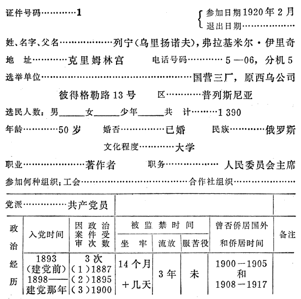 [173]这张表是在1920年2月16日和19日之间填写的。登记表前半部是用打字机打出的,政治经历栏是列宁填写的。——374。