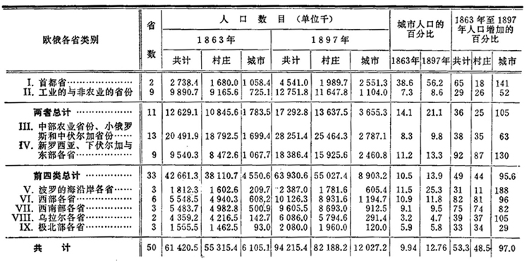 由此可以看出:只有当我们面前的地区已经住满了人而且全部土地都已被人占用的时候,才能看到纯粹形态的工业人口增加的现象。这个地区的被资本主义从农业中排挤出来的人口没有其他的出路,只有迁移到工业中心去,或者迁移到其他地域去。但是,如果我们面前的那个地区尚未全部土地被人占用,尚未完全住满人,那么,情况就根本不同了。这个地区的人口,从人烟稠密的地方的农业中被排挤出来以后,可以转移到这个地区的人烟稀少的那部分地区去“耕种新的土地”。于是有农业人口的增长,这种增长(在某一时期内)并不比工业人口的增长慢,如果不是更快的话。在这种场合下,我们看见两种不同的过程:(1)资本主义在旧的人烟稠密的地域或这一地域的一部分地区的发展;(2)资本主义在“新的土地”上的发展。第一种过程表现了已经形成的资本主义关改革后的俄国向我们展现的,正是这两种过程的同时出现。在改革后时代初期,即在60年代,欧俄南部与东部边疆地区是人烟相当稀少的地区,因而俄国中部农业区域的人口就像巨流般地向这里移来。新的土地上新的农业人口的形成,在某种程度内也掩盖了与之平行进行的人口由农业向工业的转移。为了根据城市人口的资料来清楚地说明俄国的这种特点,必须把欧俄的50个省分成几个类别。我们举出1863年和1897年欧俄9个地区的城市人口的资料。①