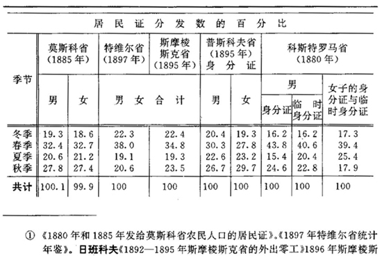 一切材料都证明,外出做零工的情况有巨大的与日益加剧的增长。身分证收入从1868年的210万卢布(1866年为175万卢布),增加到1893-1894年度的450万卢布,即增加1倍多。所发出的身分证和临时身分证数目,在莫斯科省从1877年至1885年增加了20%(男的)与53%(女的);在特维尔省从1893年至1896年增加了5.6%;在卡卢加省从1885年至1895年增加了23%(而外出的月数增加了26%);在斯摩棱斯克省从1875年的100000增加到1885年的117000,1895年增加到140000;在普斯科夫省从1865-1875年的11716增加到1876年的14944,1896年增加到43765(男的)。在科斯特罗马省,1868年所发出的身分证和临时身分证,每100男子中占23.8,每100妇女中占0.85,而在1880年则占33.1与2.2,等等,等等。