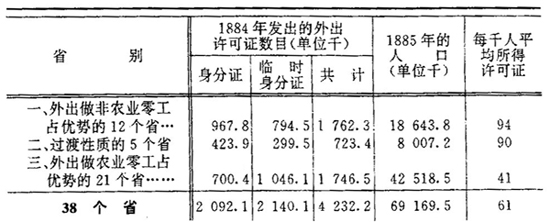 城市所提供的当然,外出做非农业零工的工人,有一部分登记在城市现有人口人数之内,或包括在上述非城市工业中心的人口之内。但只是一部分而已,因为这种人口具有流动性质,各个中心的人口调查很难把他们计算进去;其次,人口普查一般在冬季进行,而大部分手工业工人是在春季离开家庭。下面就是外出做非农业零工的一些主要省份的这方面的资料①