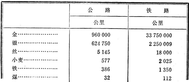 “普通公路运输的经济可行性限于较短的距离——显然取决于货物的性质和道路的质量。用这种道路运输的花费平均每吨1里约15分(1/7美元),这大体上是国内相当准确的价格。如果同时考虑到,小麦的价值每蒲式耳是1+(1/2)美元,玉米的价值是75分(3/4美元),33蒲式耳等于1吨,那么小麦的价值等于它运输330英里的费用,玉米的价值等于它运输165英里的费用……但是,还有用铁路运输的可能性,费用是1英里1.5分,或等于公路运输费用的1/10。因此,上述商品运输在经济上的极限分别扩大到3300和1650英里。在这些商品用普通公路运输时成为经济界线(极限)的那一点上,[32]用铁路运输的小麦每吨还值44美元50分,玉米每吨还值22美元20分,——这些数额代表由于完成这种工作而造成的价值的实际增大。