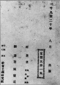 錄入者注:本書依照2011年北京大學對1920年8月陳望道譯本第一版的影印本錄入。繁體字版本基本依全書原貌進行錄入,文字和標點運用均仍其舊,因此可以看到文字運用的似乎不統一。某些實在無法依原貌進行錄入的文字(異體字),只能採用正常繁體字代替,但均是同一文字。原書中由於排版失誤而導致的文字、標點及其排列的錯誤在簡體和繁體版本中均予以糾正,錯誤的原貌以章節附註形式保留于文末。此書第一版封面曾將《共產黨宣言》誤排為《共黨產宣言》(如圖),之後的再版都已改正。