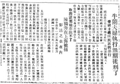[上海十七电]公共租界在十五日晨[1]破获虹口东有恒路春阳里某号取消派机关,当场捕去谢某等五人,由谢某供出彼等是取消派陈独秀的党徒,陈现匿岳州路永兴里十号,捕房下午按时往捕。陈独秀正在年老多病,卧在床上。带入捕房后,略加讯问,即送工部局医院治疗(大为优待!)。连日取消派机关因牵连而被破获者,有数处,但取消派则未捕得一个,可算侥天之幸。中国地界的公安局,现派人向租界要求引渡。查此次共被捕去十一人,供出姓名,皆不真实,除陈独秀外,仅知尚有彭述之一人,其余九人皆供词支吾。同时国民党公安局要求法院禁止旁听,所以详情不悉,仅十七日开侦察庭一次。