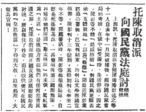 上海讯:托陈取消派首领陈独秀、彭述之等十一人自去年十一月间被捕后,颇得国民党当局的青睐,在狱中备受优待,生活舒适。因之,陈、彭等不禁“铭感肺腑”,对国民党更愿表示“五体投地”,以为“报德”。闻最近陈彭案经过公审后,已宣判结束,均判以文字宣传罪,陈、彭判十三年徒刑,其余则判七年至二年不等。开庭审讯时,陈、彭等都服服帖帖,自认是托落斯基派,一再声明与第三国际无关,并痛斥他们所谓“斯太林派”等主张,骂红军为“土匪”,最后极力否认他们有任何危害民国之罪。托陈取消派跪在国民党法庭前面如此讨饶,所以保住了性命,而且很快便可在国民党的“皇恩浩荡”下得到大赦,以至起用,大做其官咧!