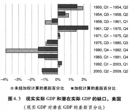 图4.3 现实实际GDP和潜在实际GDP的缺口,美国