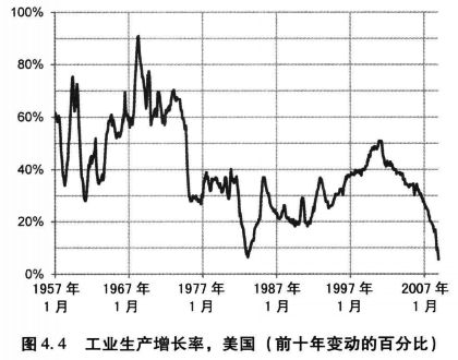 图4.4 工业生产增长率,美国(前十年变动的百分比)