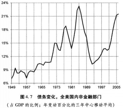 1981年,总负债是GDP的145%。2007年,它是GDP的253%。然而,如果1973年后实际GDP以它在1947至1973年间的平均速度增长,那么2007年总负债就将只有GDP的180%。[9]因此,这种情况下负债比例自1981至2007年期间就将只增加35个百分点,而这一期间它实际上升了108个百分点。这意味着负债比例的增长中超过三分之二是因1973年后实际GDP增长的放缓所导致的。