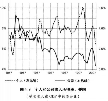 国债对GDP的比率自1970年以后的全部增长,都可以归结为美国公司盈利能力的下降和公司所得税率的降低。随着公司所缴纳的所得税的下降,盈利能力下降的大部分影响,在整体上从公司转移到了社会公众。尽管联邦政府得到的个人所得税收入在GDP中的比重自1967年以后增长了,但公司所得税收入则显著下降(见图4.9)。后者之所以下降,部分是因为公司税前利润的相对下滑,部分是因为公司税率的降低。在1947至1969年期间,税前利润平均为GDP的11.6%。在1970至2007年期间,这一平均值下降了接近四分之一,达到8.8%。1947 6至1969年期间,税前利润的平均有效税率为36.8%,而在1970至2007年期间,这一数字下降了超过三分之一,达到23.5%。[11]