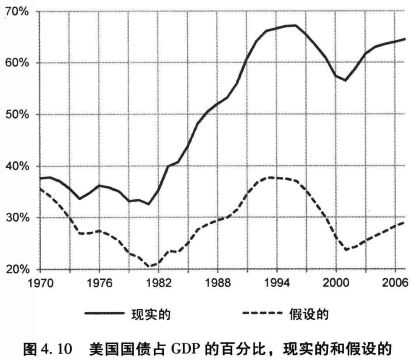 图4.10 美国国债占GDP的百分比,现实的和假设的
