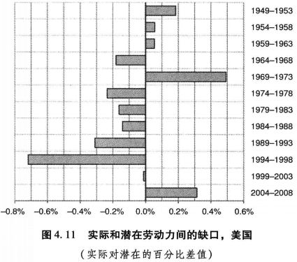 在1949至1973年期间,实际劳动力平均比潜在劳动力多0.13%。[13]但是在1974至2008年期间出现了相反的情况;平均来说,实际劳动力下降到比潜在劳动力低0.17%。图4.11显示了自1949年以来5年期实际和潜在劳动力的缺口百分比,它表明1949—1973年和1974—2008年的平均数字,在整体上对于这些时期是相当有代表性的。1973年以前,除了一个5年期间以外,其他全部时期实际劳动力都超过了潜在劳动力,而1973年以后,除了一个5年期间以外,其他全部时期潜在劳动力都超过了实际劳动力。