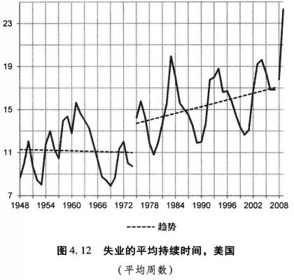 图4.12考察了失业的平均持续时间(均值)——即当前失业者(那些在过去一个月中没有工作但积极寻找工作的人)失业的平均周数。[14]在1948至1974年期间,这个持续时间的数字是平均11.2周,并且随着时间的推移而轻微下降。但是在1975至2007年期间——也就是说甚至直到最近这场衰退之前,这个持续时间的数字上升到平均15.4周,增加近40%。在这一时期,它自始至终显著地上升。
