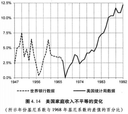 图4.14显示了1947至1992年期间美国家庭收入不平等程度的变动。它使用基尼系数(Gini coefficient)来衡量不平等;当系数上升时,不平等加剧。这幅图结束于1992年,这是因为美国统计局1993及之后年份的数字,与此前年份的数据是不可比的。[16]收入在1968年是最为平等的,但此后不平等的程度几乎在持续提高。因此,趋于更大不平等的趋势在新自由主义之前很久就已经开始,甚至它还早于1973—1975年的衰退。