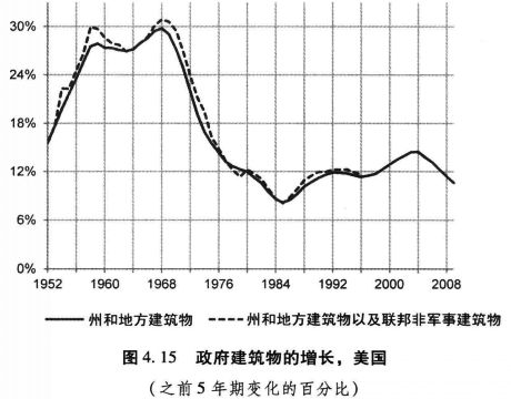 [18] 我关于联邦、州及地方政府的非居住、非军事建筑物的“数量”的数字,来自于BEA的固定资产表7.2A第65行和第66行,以及固定资产表7.2B第74行和第75行。图4.15中“州及地方政府和联邦政府的非军事建筑物”序列是州及地方的数量指数与联邦的数量指数的加权平均。其权重是这些建筑物中以其现期成本计价的属于州及地方政府的比重和属于联邦政府的比重;我的这些数据来自于固定资产表7.1A第65行和第66行,以及固定资产表7.1B第74行和第75行。由于我们在这里关注的是建筑物的实物数量,因此使用现期成本的数字是合适的。