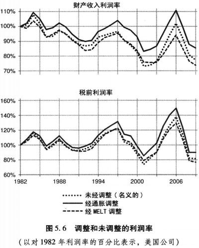 图5.4和图5.5显示了二战以后三个利润率的轨迹,它们是:经通货膨胀调整的利润率,经MELT调整的利润率以及用于比较的未经调整的利润率。总体来说,调整并没有显著地影响利润率的趋势,尽管它们导致利润率远远低于未调整的利润率。1970年代这个通货膨胀不断迅速加速的时期是这一总体结果的一个主要的例外。1970至1979年期间,名义(未调整的)利润率大幅上升,但4个经过平减的利润率中有3个下降了。(余下的那个经过平减的利润率——即经MELT调整的税前利润率——上升了3%,而与它对应的名义利润率上升了30%。)