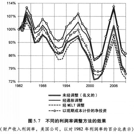 这里有些例子来说明我的意思。如果我们关注公司的投资行为,我们应当考察公司了解和关心的衡量盈利能力的方法,而不是“根本性的”衡量方法,因此原则上我们应当考察预期利润率而不是实际所实现的利润率。然而,如果我们(在这里我就是)关注对盈利能力的历史趋势进行评估,那么我们就应当引证现实中实现的利润率。如果我们(如我将在第六章要做的那样)希望探究利润率和股市回报率之间的关系,或者作为投资决策的决定因素的利润率,那么以“狭义”利润——例如税后利润为基础的利润率可能就是比较合适的。另一方面,如果我们希望探讨以阶级为基础的收入分配的变化对利润率所造成的影响(如我在第七章所要做的那样),那就需要一个以广义利润为基础的利润率,例如像我的财产收入利润率那样。如果我们希望去解释观察到的利润率的波动,那么以理论为基础的衡量利润率的方法,例如针对MELT的变化而调整的利润率,和/或针对价格水平的变化而调整的利润率,在分析中或许会起到重要的作用。如果我们希望解释诸如危机和衰退等现象,以理论为基础的衡量利润率的方法或许会比直接观测到的利润率更为合适。
