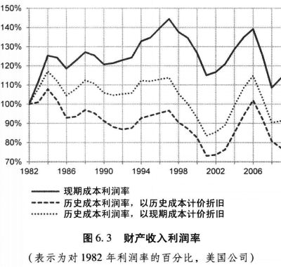 尽管如此,在过去三十年中,现期成本“利润率”明显同我们在第五章所考虑的历史成本利润率相背离。图6.3比较了财产收入利润率。在1982至1997年期间,现期成本利润率上涨了44%,而历史成本利润率(并且以历史成本计价折旧)却下跌了3%;在网络公司泡沫达到顶点时,历史成本利润率仍然低于1980年代早期深陷于衰退的时期。随后,在1997至2001年间两个利润率出现了相同程度的下降,但其结果是,现期成本利润率在2001年低点时比1982年低点时仍高出15%,而历史成本利润率在2001年比1982年低27%。