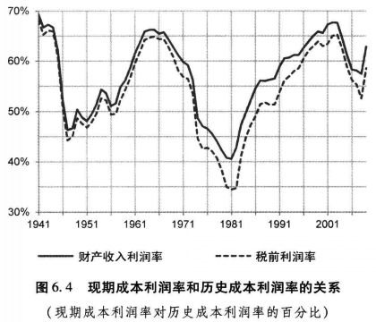 图6.4显示了自大萧条结束以来现期成本利润率与标准的历史成本利润率两者之间的关系。如果考虑财产收入利润率,现期成本利润率对历史成本利润率的比率在1941至1947年间下降了33%,之后在1947至1965年间上升了43%,随后在1965至1981年间下降39%,其后在1981至2002年间再次上升,升幅为67%。如果考虑税前利润率,两者的关系甚至波动更加剧烈;在相同的四个子时期中变动的百分比分别是-35%,47%,-47%和89%。这一比率自1960年代中期至1980年代早期的下降,是这个子时期中不断加速的通货膨胀所导致的结果。而这一比率随后的上升则是此后所发生的去通货膨胀(disinflation)所导致的结果。换句话说,由于重置成本衡量方法回溯性地重新计价了资本资产,而不是以获得它们的价格来计价,因此这种衡量方法在不断上升的通货膨胀时期增大了利润率的分母,从而人为降低了利润率,并且在去通货膨胀时期减小了分母,从而人为提高了利润率。