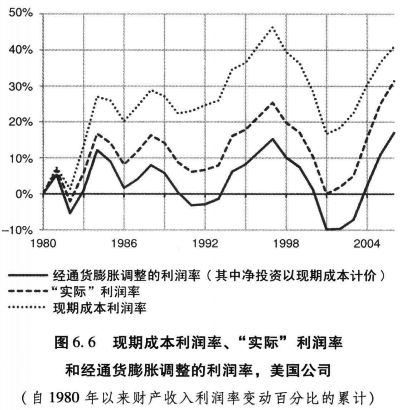 图6.6 现期成本利润率、“实际”利润率和经通货膨胀调整的利润率,美国公司