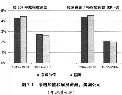 尽管总薪酬没有停滞,但它的确在最近几十年比二战后早期增长得更慢。图7.1提供了美国公司所生产的实际产出(净增加值)的年均增长率以及它们所支付的雇员实际薪酬的年均增长率。如果我们用GDP平减指数对通货膨胀进行调整,我们发现1973至2007年间的年均增长率比1947至1973年低41%。如果我们用消费者价格指数(CPI-U)对通货膨胀进行调整,我们发现年均增长率低了56%。此图清楚地表明,薪酬增长的下降伴随着、并且几乎可以完全归结为公司净增加值增长的类似程度的下降。[1]