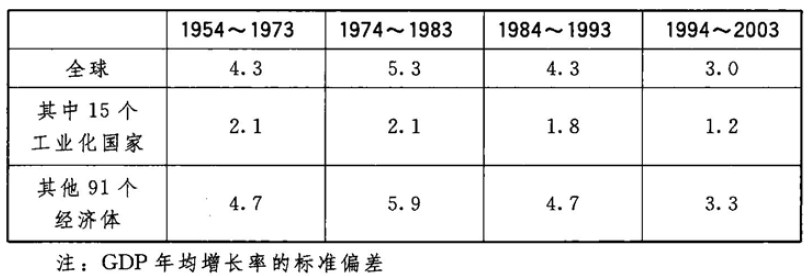 尽管如此,从表6.2可以看出,1993年后的10年是第二次世界大战战后发展最稳定的10年,产出不断地增加,而无论是发达国家还是不发达国家经济发展的波动性则要比20世纪50年代和20世纪60年代低了约1/3。可是低波动性并不意味着高活力。例如,日本在20世纪90年代经济滞涨时的产出增长要比早些年发展迅速时稳定得多。然而,产出的相对稳定总有几分反常。正常情况下,要么由金融体系产生出来的更大的不稳定会被经济供给方面的小问题,特别是工资压力而抵消,要么经济政策会在缓冲由各种冲击带来的不稳定方面有所改善。
