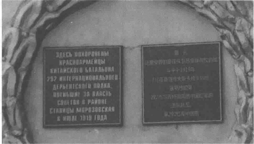 为保卫苏维埃政权,新霍皮奥尔斯克的红军近卫军第二莫斯科军团与白匪军顽强作战。为纪念此战役中牺牲的红军战士和18位中国志愿者,苏俄政府于1921年在该市中心建立了革命公墓,亦称“兄弟墓"。后来由于城市基础设施改造和布局结构调整,“兄弟墓”被拆除。1970年,在原“兄弟墓”位置重新建立了俄国内战争烈士纪念设施,保留至今。中国志愿者纪念碑是纪念设施的一部分,碑呈长方形,高约1.5米,长约3.5米。上面用俄文刻着“18位中国志愿战士和区革命战士赤日马科夫、波波夫、利特维诺夫、尼古拉耶恩科、卡尔波夫、阿尼休科、安东诺夫、沙普宁、雅布洛奇金、贝利涅夫永垂不朽”。