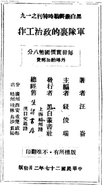 中文马克思主义文库 -> 参考图书·阶级斗争文献 -> 军队里的政治工作(1938年)