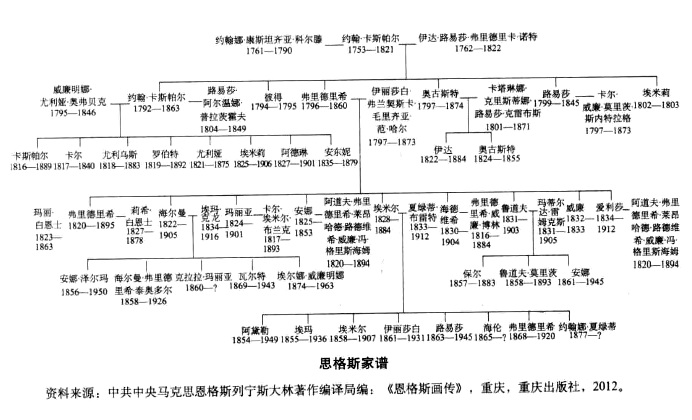 恩格斯的家族血统或他所受的教育都不能让他预示到未来的革命。一个繁荣的商业家族,具有强烈的宗教精神,而对学习的轻视(甚至不允许恩格斯完成他的学业)使得它似乎不是培育社会主义知识分子的沃土。这个家族的财产,根据它的一个传统,源自胡格诺派,是由恩格斯的曾祖父约翰·卡斯帕尔·恩格斯牢固确立的。他在位于莱茵省杜塞尔多夫附近的巴门创建了一家漂白和纺纱工厂。恩格斯的父亲与戈弗雷·欧门和彼得·欧门合股,创办了一个繁荣的企业,该企业在巴门和曼彻斯特都有工厂。他的妻子,一个比他更温和、更敏感和幽默的人,来自一个荷兰的教师家庭。他们的儿子弗里德里希,生于1820年11月28日,是家里八个孩子中的长子。