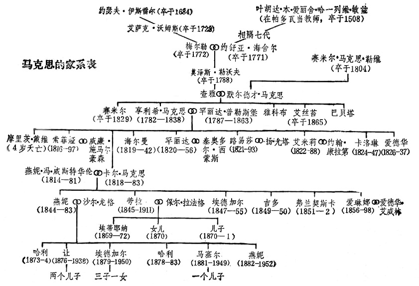 卡尔很喜欢他的姐姐——索菲娅,但看来跟他的母亲——罕丽达不那么亲热,特别是在后来。不过,他却通过他的母亲的家庭关系跟现代资本主义世界发生了微妙的关系。他的姨父——B.F.D.菲力普斯,是荷兰扎尔特博默尔的一位银行家,马克思从外面回到特利尔的时候经常去看他,然而马克思在一生里却往往向他借不到钱。马克思当时常见到他的两位表兄弟——赫拉尔德和安东·菲力普斯,这两人一帆风顺,到1891年建立了一家电气公司,即目前在埃因霍温的菲力普电器公司。有一次这两个家庭的后代在一起聚会,据说菲力普斯家族向马克思家族说:“你们只是谈论资本,而我们却赚取资本”。