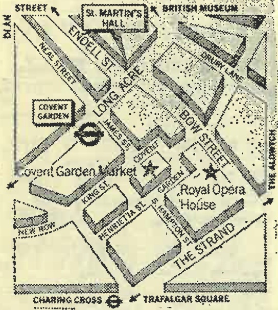 19世纪50年代至60年代初,到这个地区来的访问者当中包括一批社会主义者,这样,科文特花园这个看来比索荷更难于酝酿革命的地方,在马克思的传记中便一时突出起来。其原因在于,在朗-(艾克街,即离市场不远的地方,有个圣马丁堂(见第82页地图),这是第一国际在1864年9月25日开会的地点。