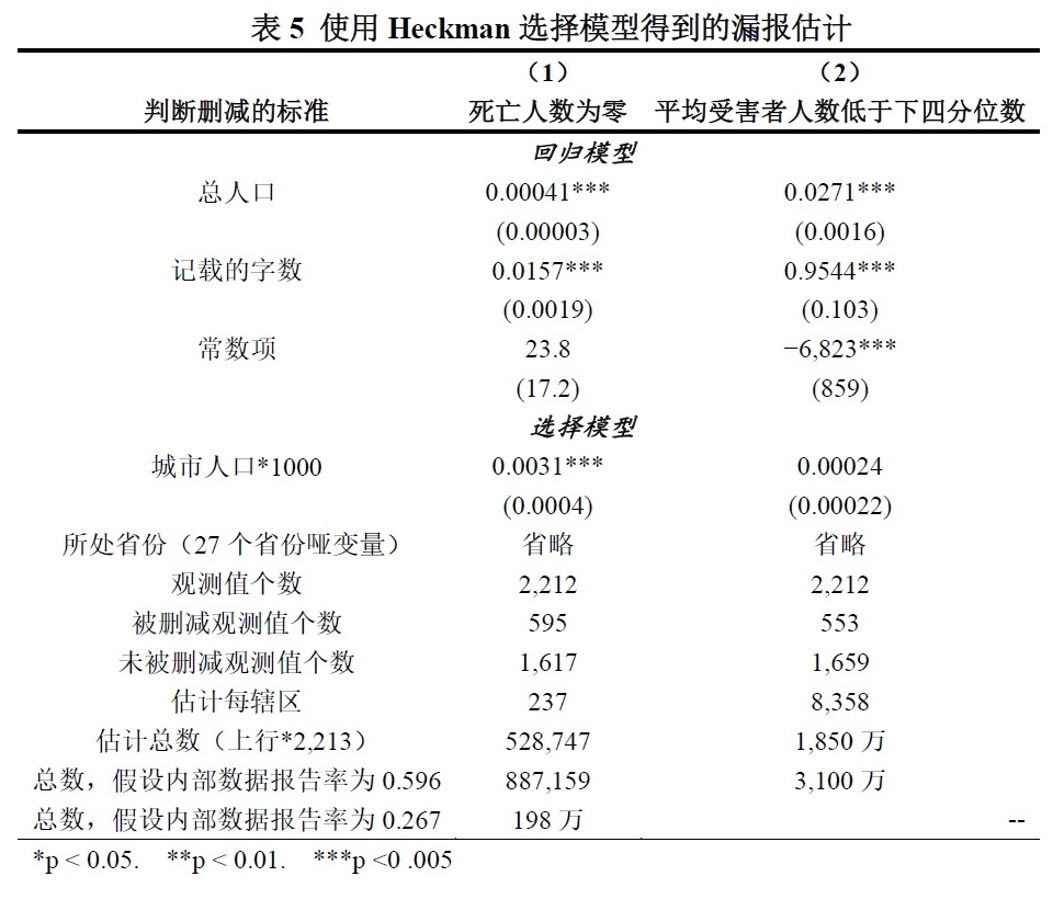 在对死亡人数(第一列)进行估计时,我们认定其中595个数据遭到删减,并基于其余1,627个数据进行第二阶段估计。用第二阶段的回归系数乘以人口和记录字数的样本均值(分别为320,285人和4,969字),并加上常数项后,模型得到528,747人的死亡人数估计。这一数字比地方志记载的原始数据的两倍还多。如果所有地方志都以大致相同的比率记载伤亡人数,那么这就是我们对地方志本应记载的死亡人数的统计估值。如果根据我们对瞒报可能性的估计值上限(0.596)和下限(0.267)进行调整(根据前文对公开和内部数据的比较而得),我们得出死亡数据最低为887,159人,最高为198万人。