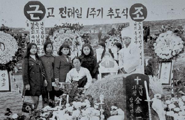 一九七〇年十一月十三日,有一位青年在汉城市和平商场附近往自己身上浇汽油焚身自杀了。他就是当年才二十一岁的全泰一。他用自己的死号召工人们团结起来,为改善在和平商场(被服厂密集的地区之一)等地作工的工人特别是年轻女工的极其恶劣的劳动条件展开斗争。