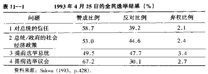表11—1表明了全民公决的结果,尽管投票数没有高到足够使第二个或第四个问题的投票具有约束力,但四个问题都获得了赞成票,总统的职位在三个问题上取得了胜利,只有第三个问题让他失望。