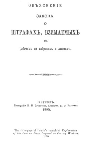 Tapa del folleto de V. I. Lenin, Explicación de la ley de multas que se aplica a los obreros en las fábricas. 1895. |