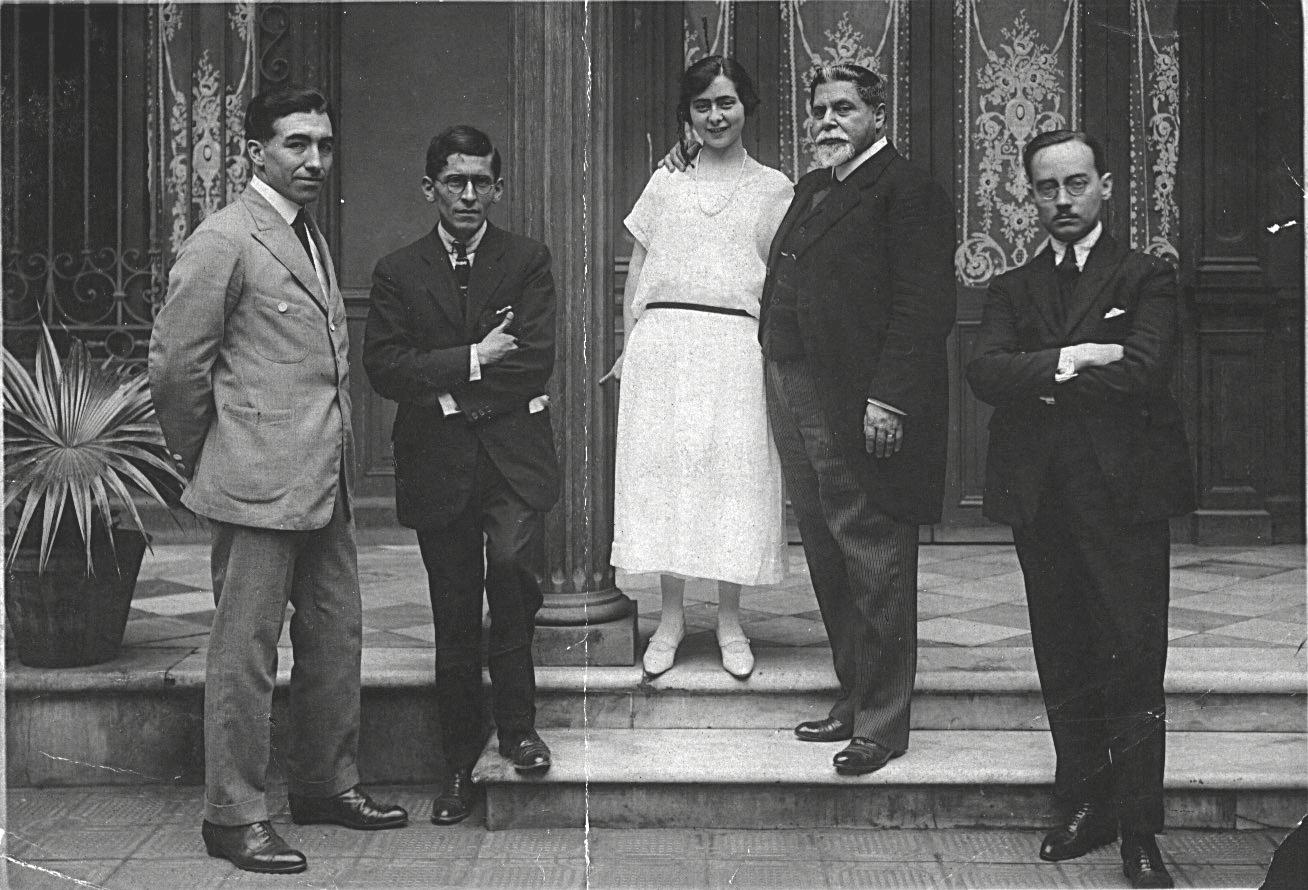 Lima. De izquierda a derecha: n.n., Amalia La Chira de Mariátegui (madre de JCM), Waldo Frank, Anna Chiappe, Hugo Pesce,